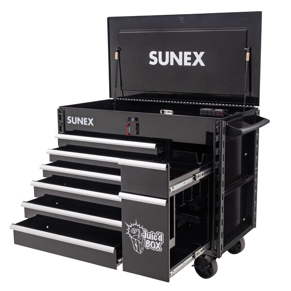 The Sunex JUIC’D Box combines high-capacity storage with built-in power, allowing you to charge tools and run equipment directly from your workstation. With heavy-duty construction and a large drawer system, it is designed for demanding professional environments.
